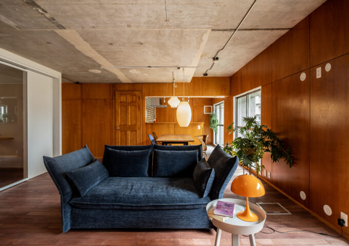 大胆な躯体のコンクリートと無垢材やなどは持つ貼りものではない本物の素材感を活かし、ミッドセンチュリーを感じるテイストとの組み合わせで仕上げた空間です。2面バルコニーからの日当たりと通風が気持ちいい暮らしのご提案です。販売価格
